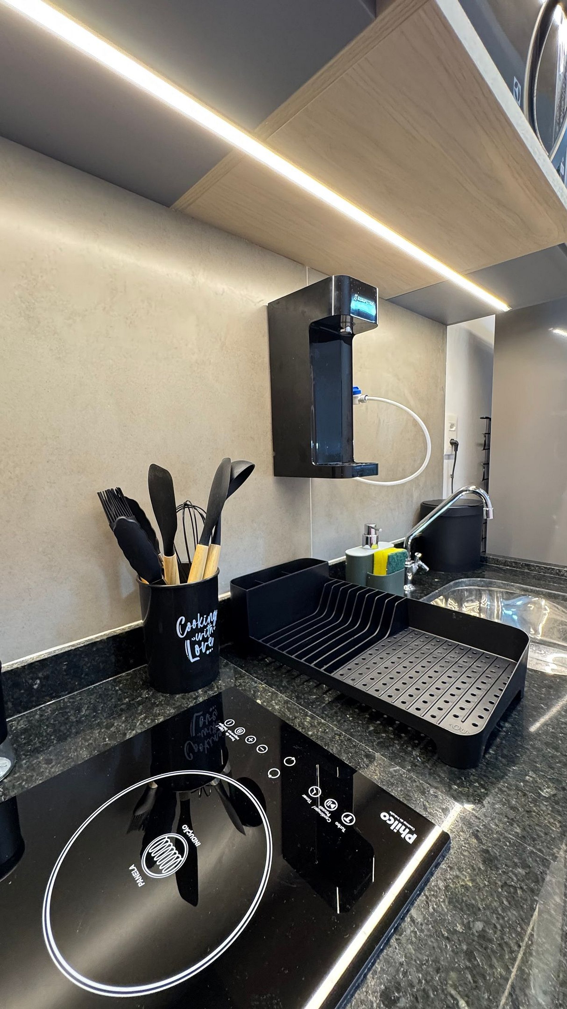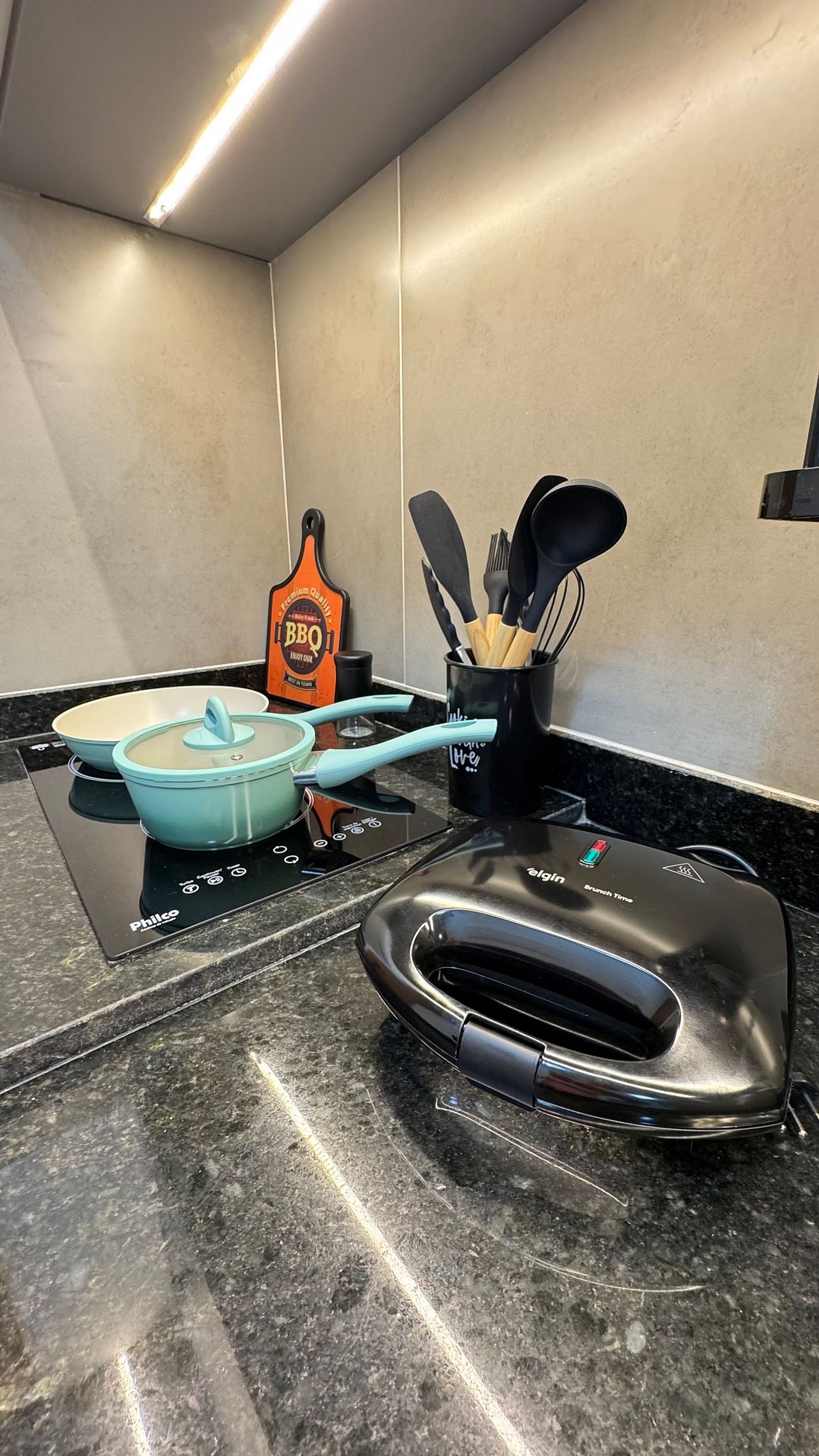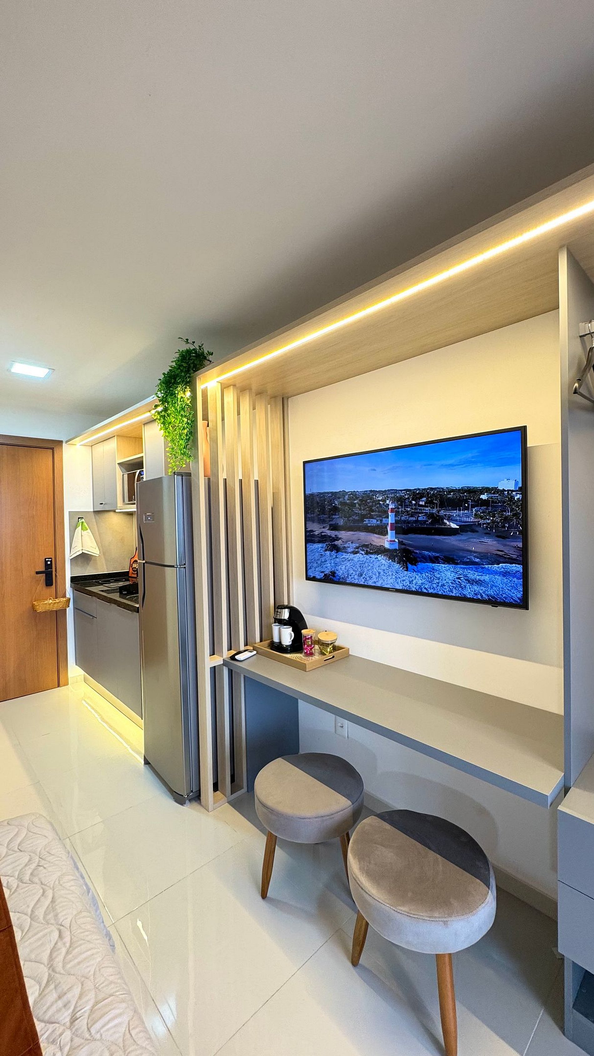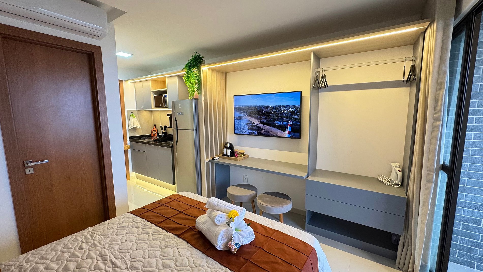 O Studio é completo, com uma cama de casal confortável para suas noites de descanso e uma cozinha compacta equipada com fogão de indução, micro-ondas, cafeteira, geladeira, liquidificador, sanduicheira e utensílios para preparar suas refeições, a varanda te levará a contemplar o mar de Itapuã.