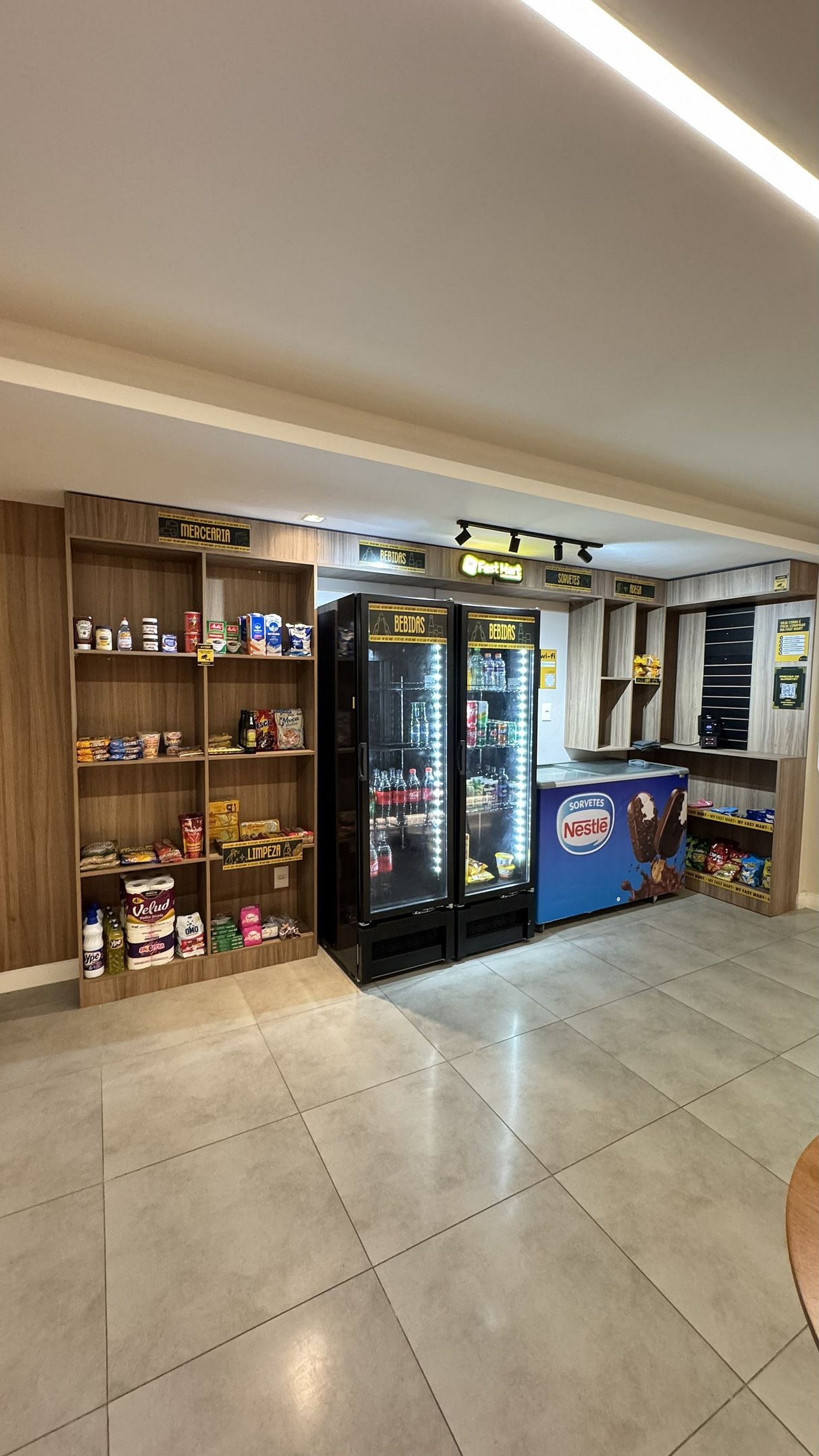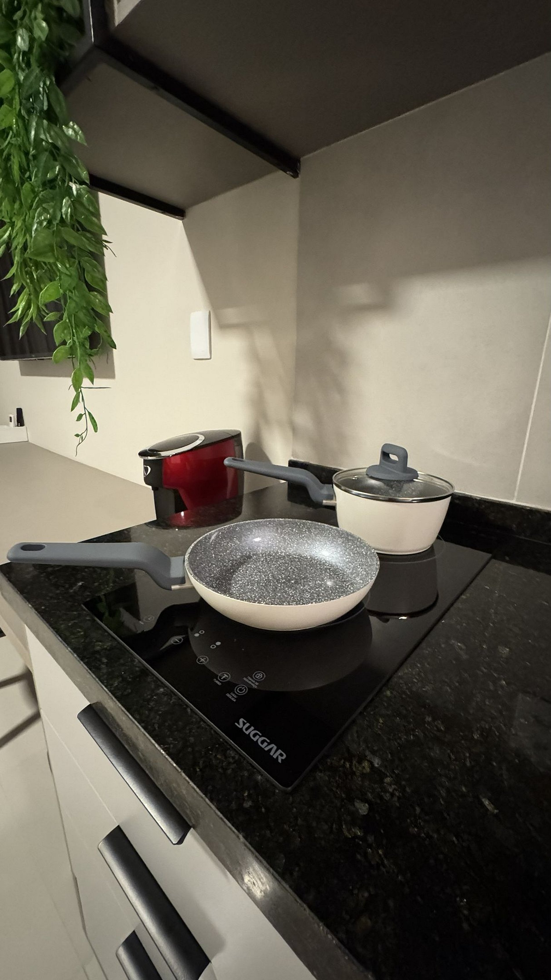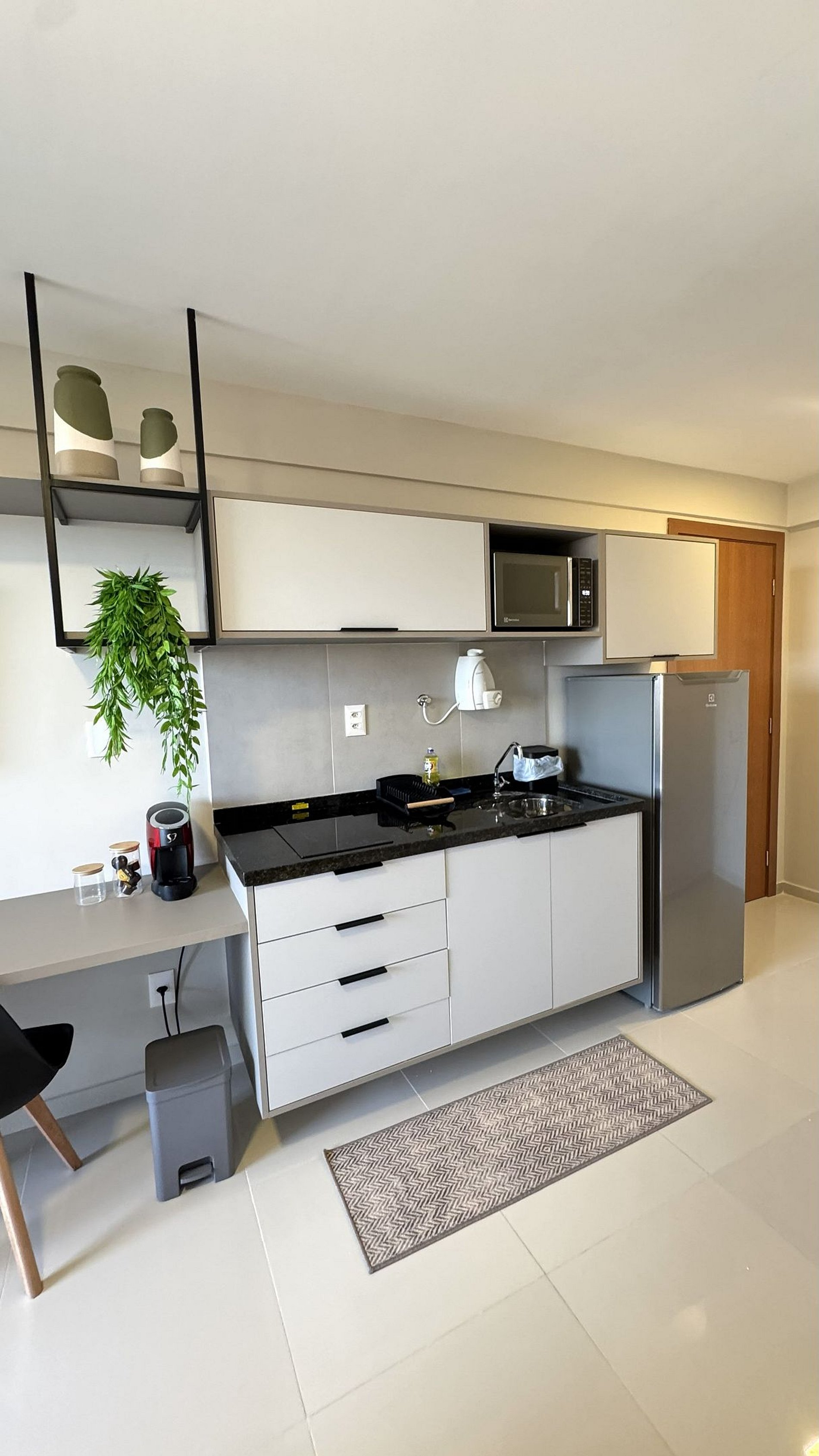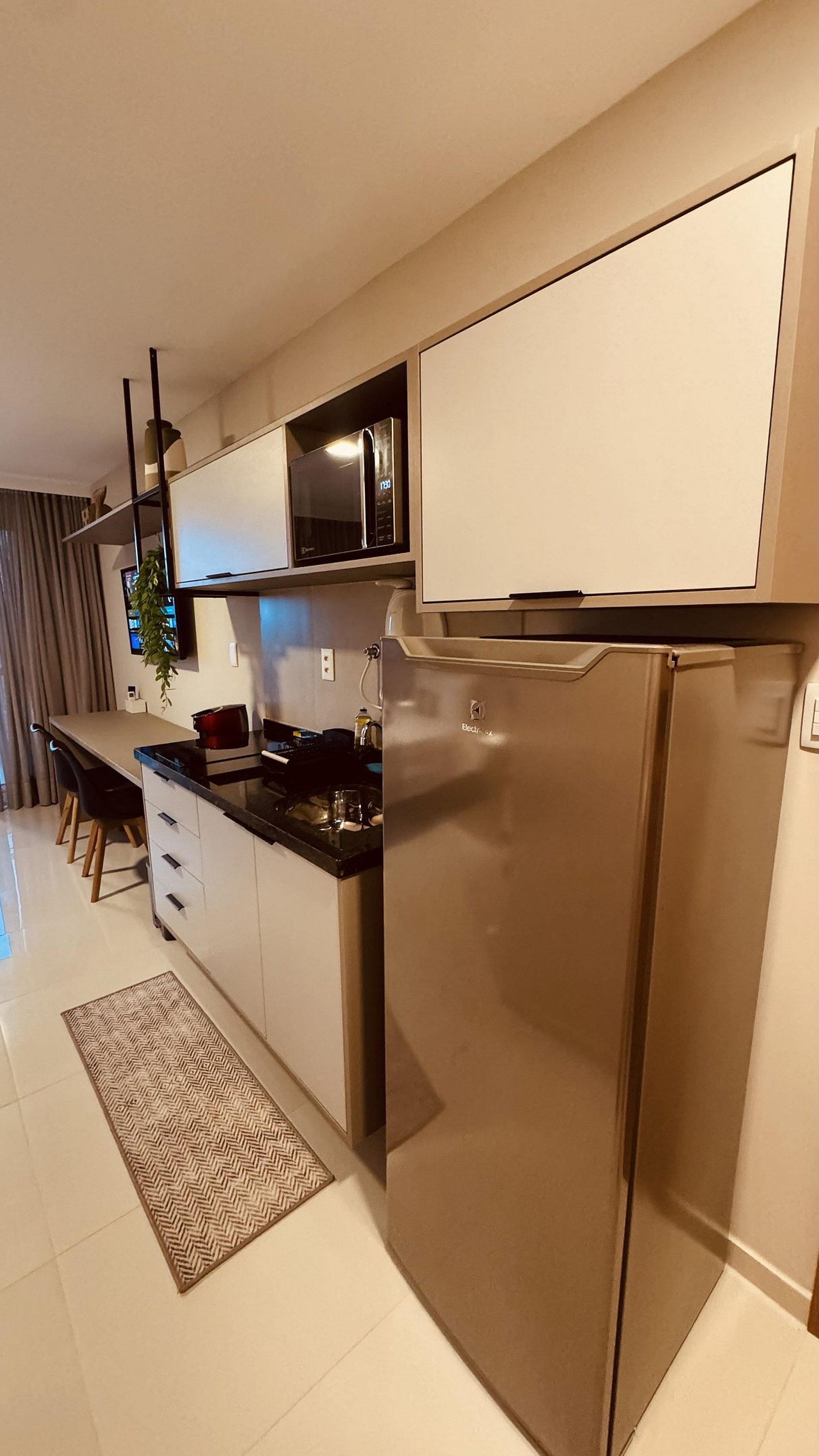 • Cozinha compacta equipada com: Geladeira, Fogão de indução, Micro-ondas