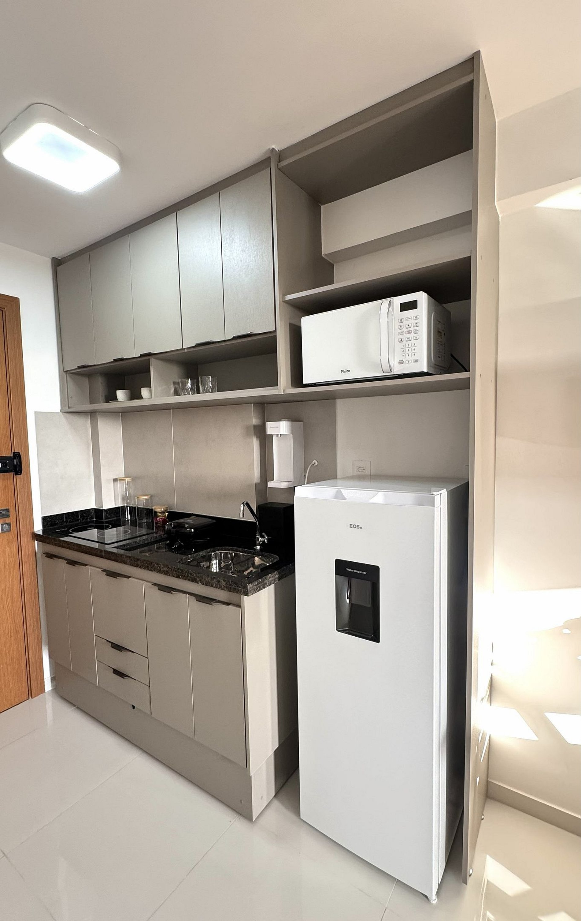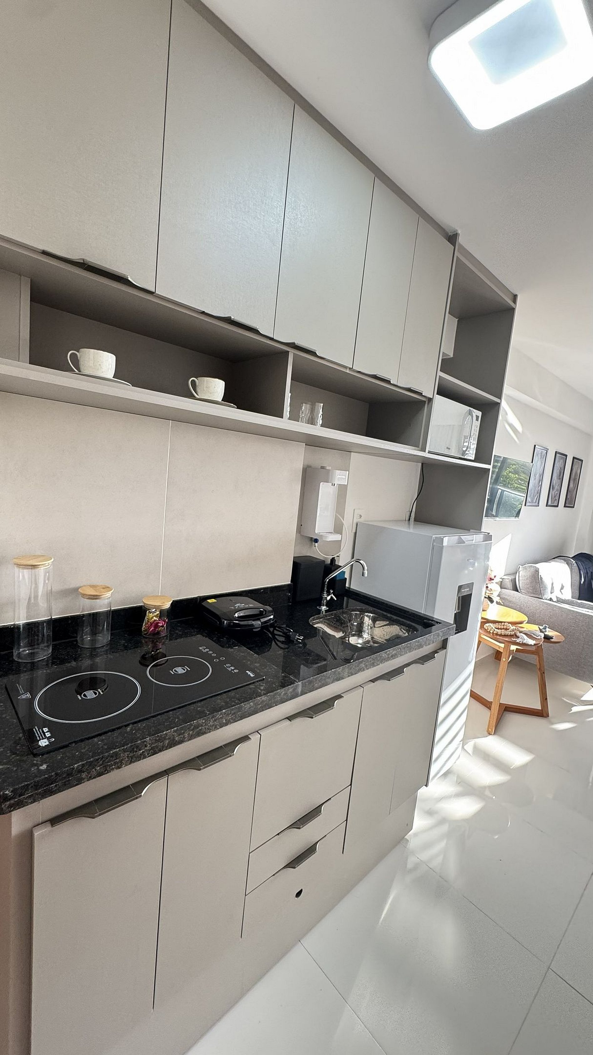 Cozinha compacta e completa: microondas, geladeira, fogão por indução e utensílios essenciais para preparar suas refeições. - Acomoda um casal: Televisão com 200 canais e wi-fi para seu entretenimento. - Desfrute de vistas deslumbrantes do pôr do sol e da lua cheia diretamente da sua varanda.
