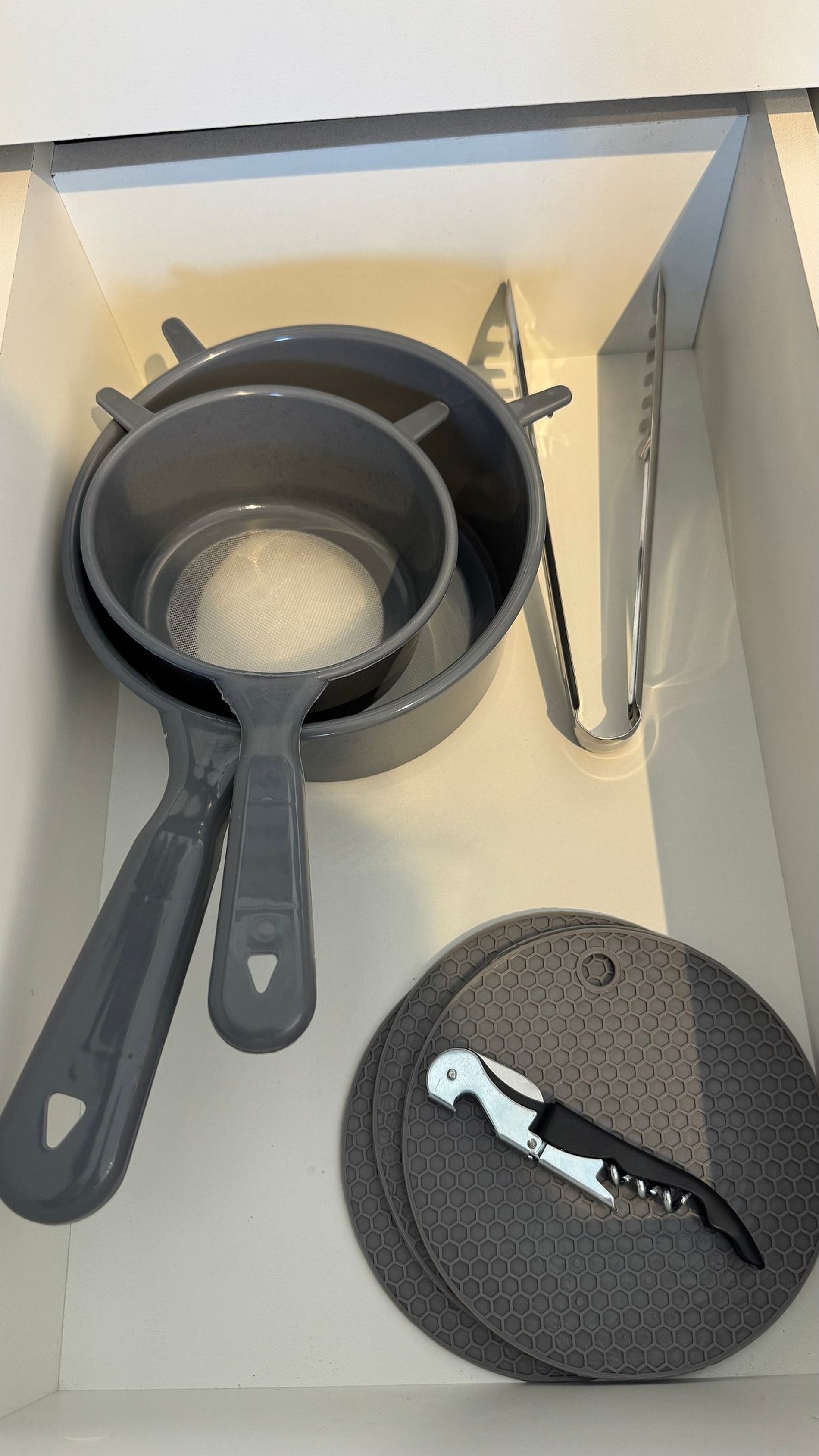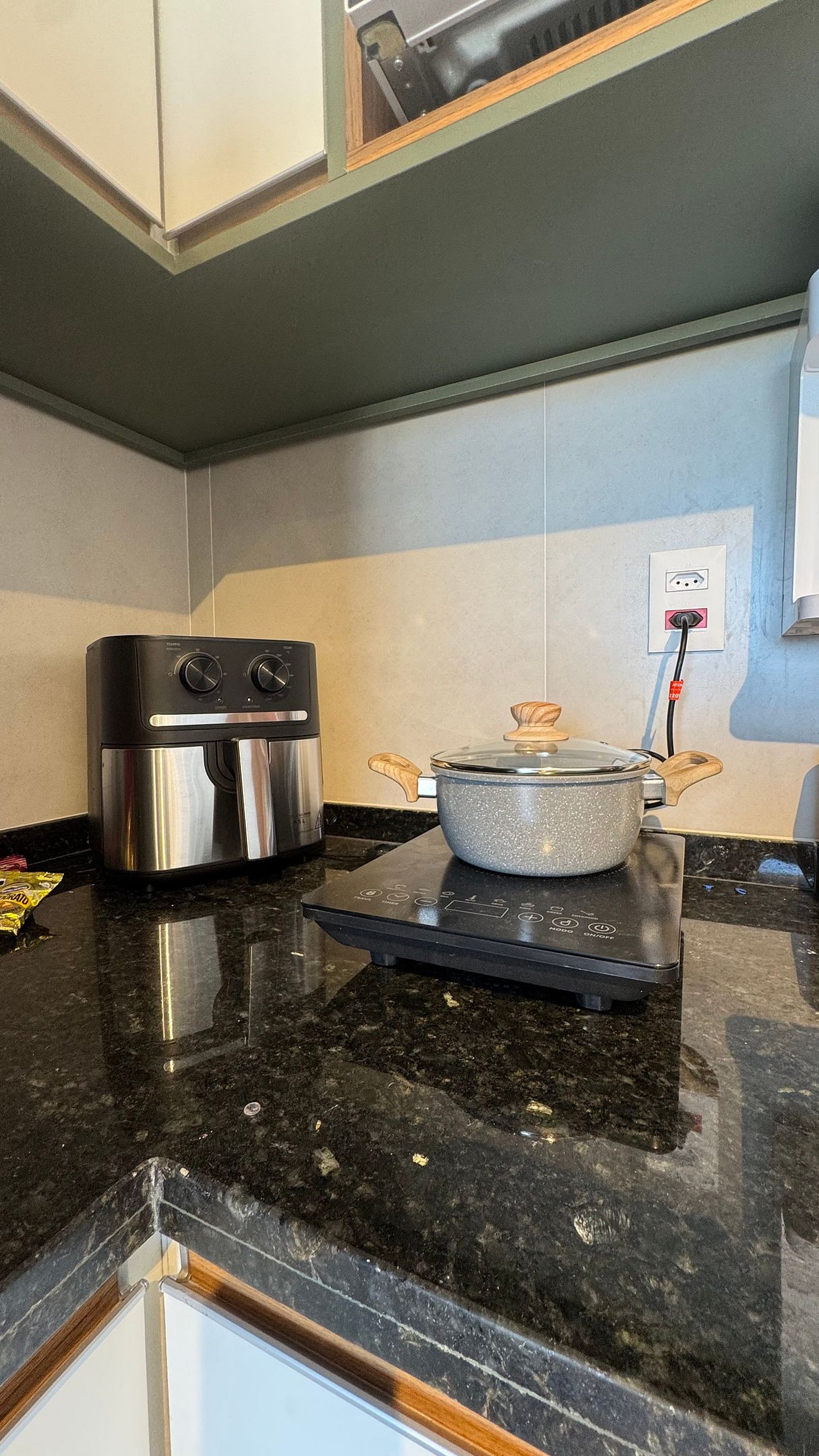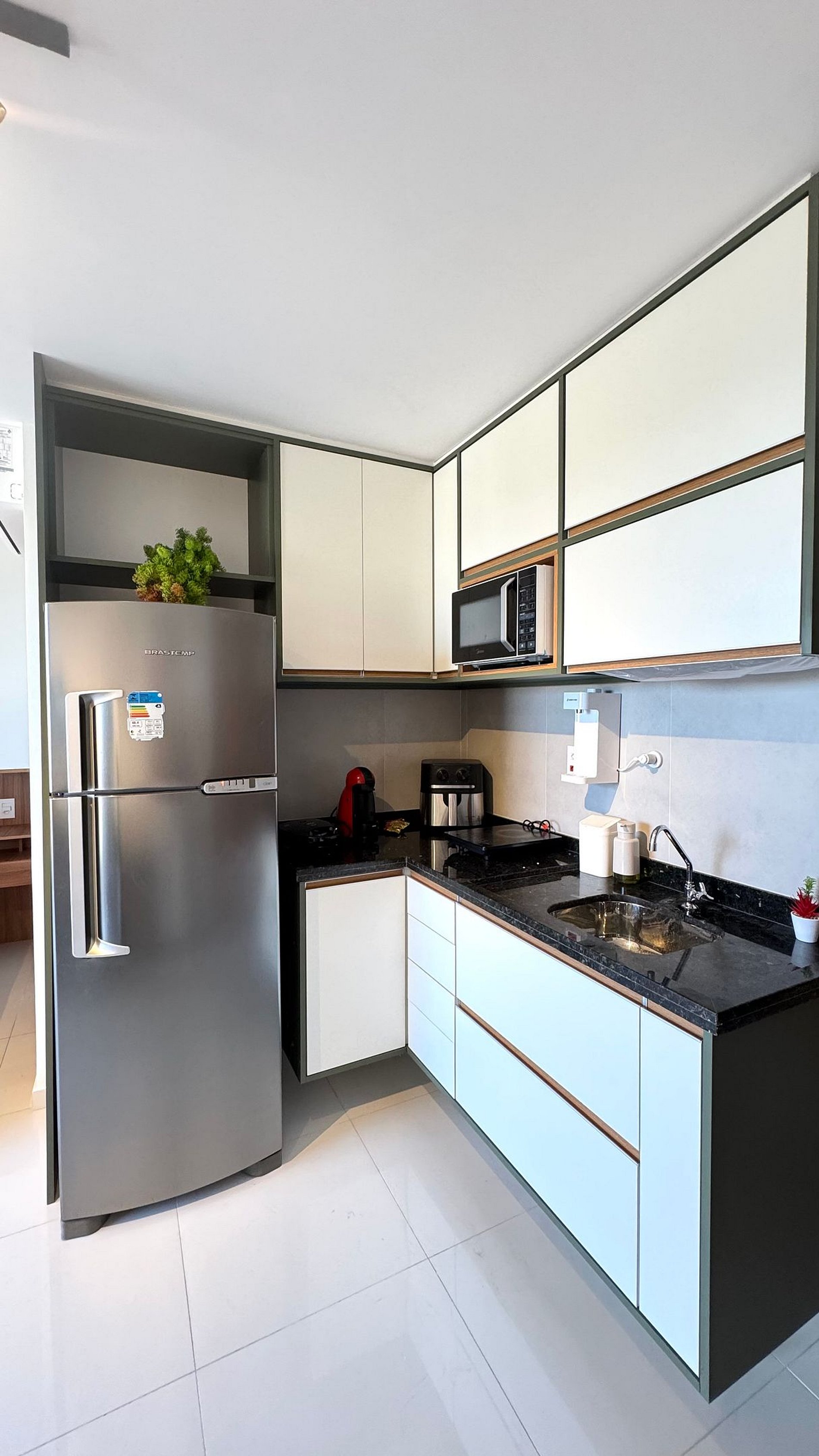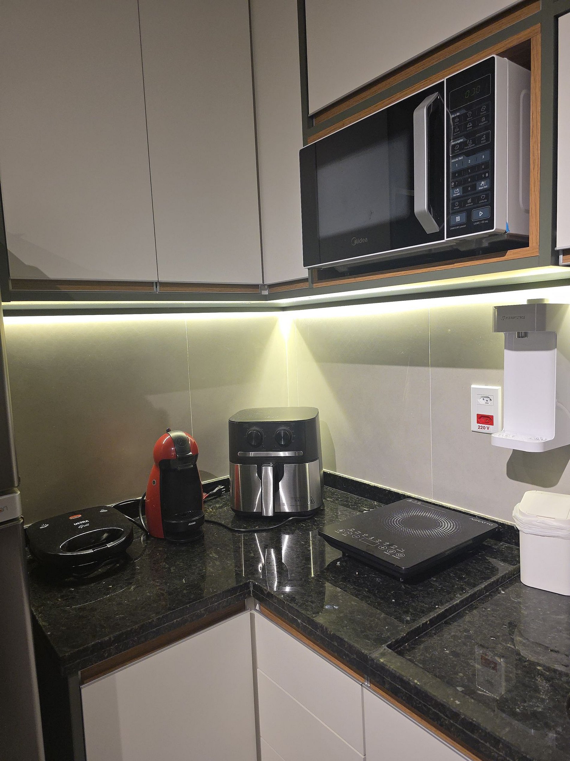 Prepare suas refeições com praticidade em uma cozinha compacta e equipada com geladeira, fogão de indução, micro-ondas, air fryer, liquidificador e utensílios completos.