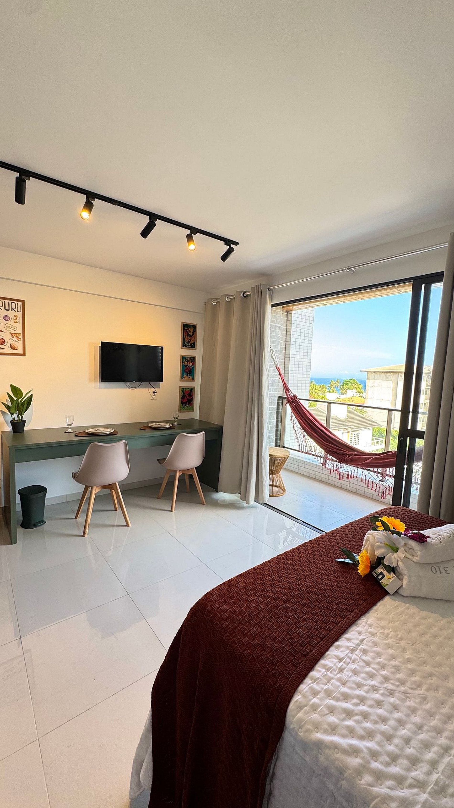 Pensado nos mínimos detalhes, o Studio oferece um ambiente acolhedor, com cama de casal confortável, enxoval completo e uma atmosfera que convida ao descanso. A rede é o lugar ideal para relaxar após um dia de praia, leitura ou trabalho.