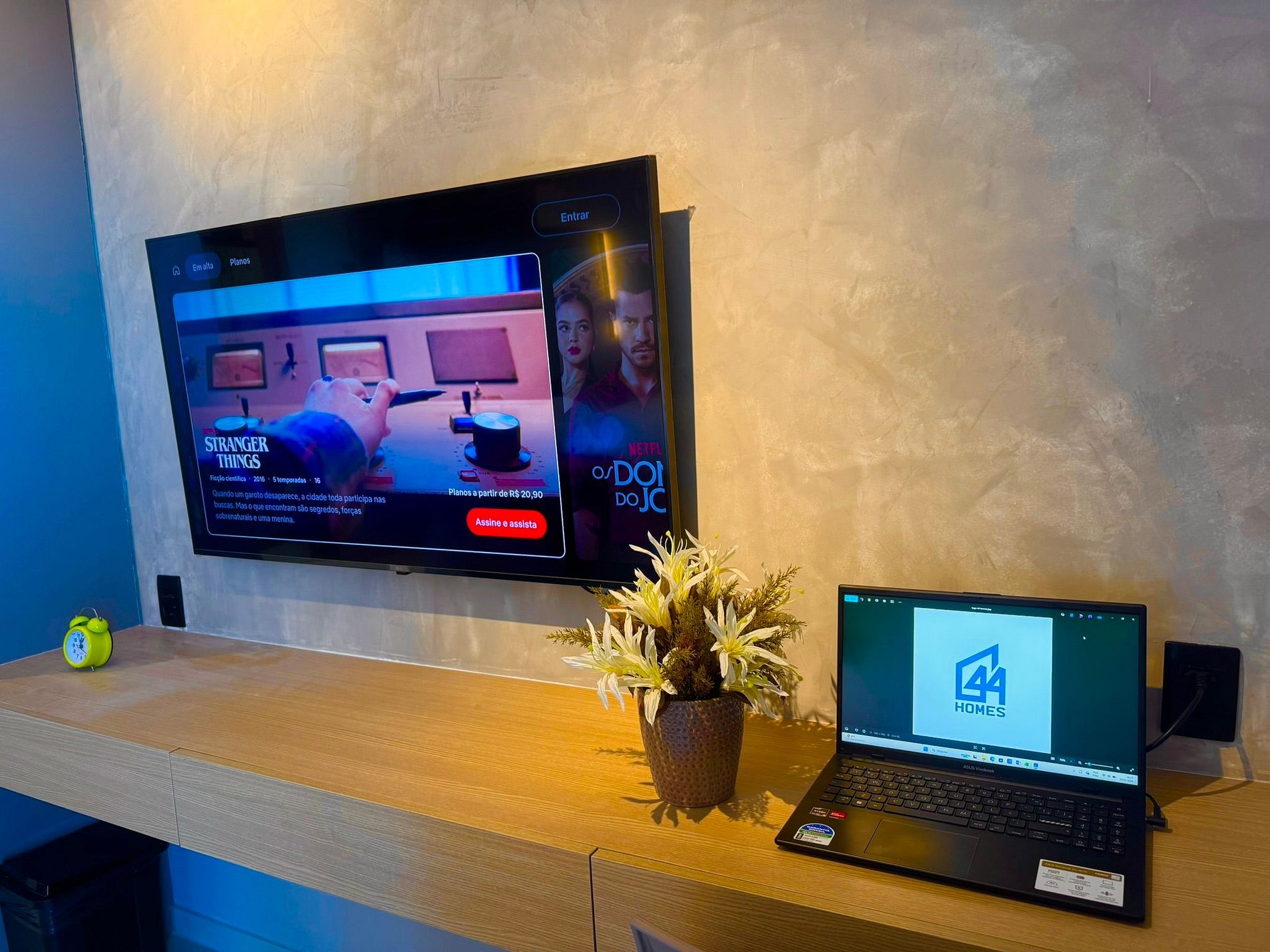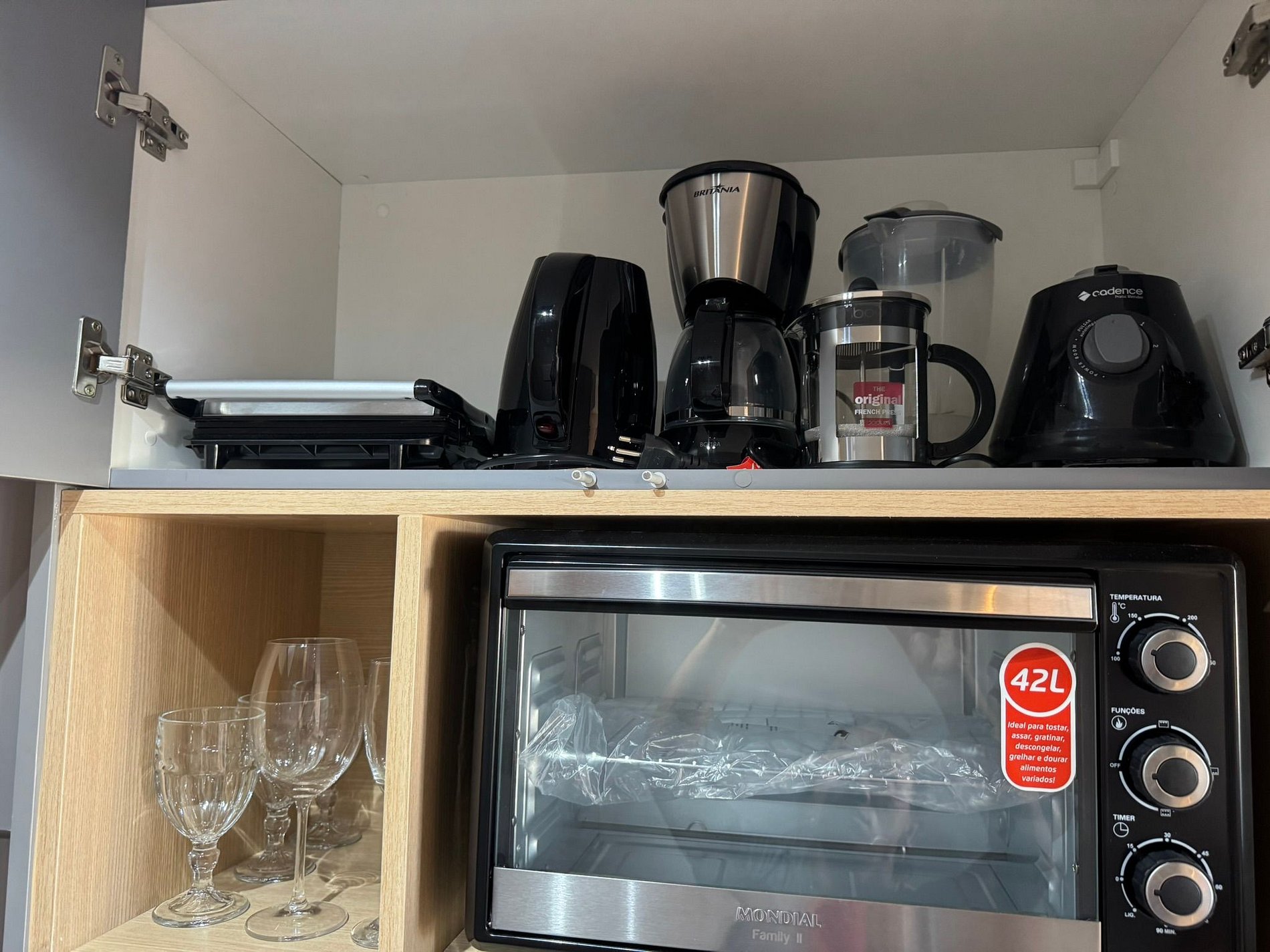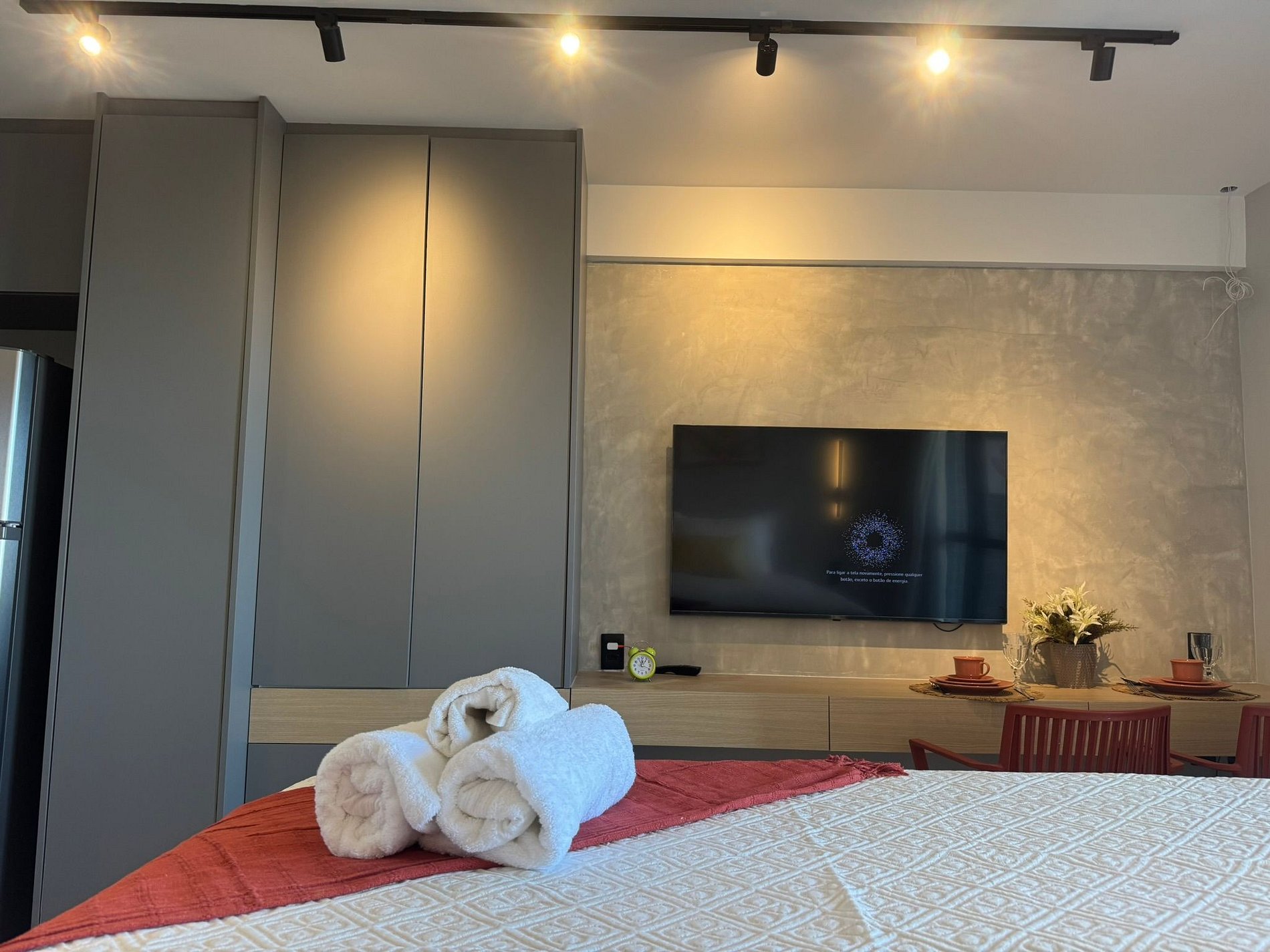 O Stúdio conta com área dedicada para trabalho, Wi-Fi rápido e TV de 55 polegadas com mais de 200 canais, garantindo conforto tanto para lazer quanto para quem precisa trabalhar durante a estadia. A cozinha é compacta, porém completa, equipada com fogão de indução, mini forno elétrico, micro-ondas, geladeira, liquidificador, chaleira elétrica, prensa francesa, sanduicheira, além de panelas, utensílios e copos adequados para pequenas refeições, incluindo copos para wisque e taças de vinho, champanhe e cerveja.
