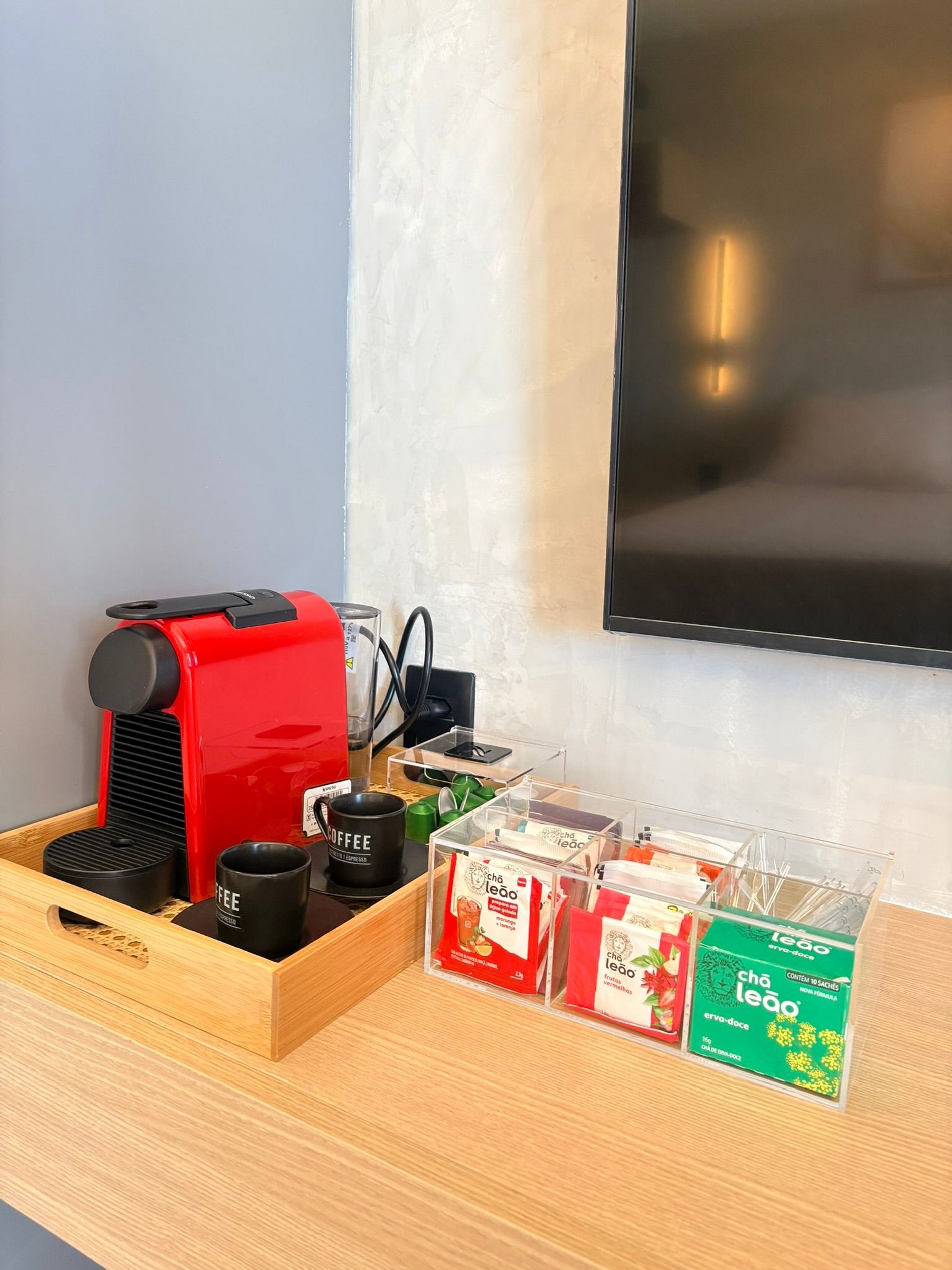 Para começar bem o dia, o apartamento também oferece café em cápsulas e chá, pequenos gestos de cuidado que transformam cada manhã em um momento especial.