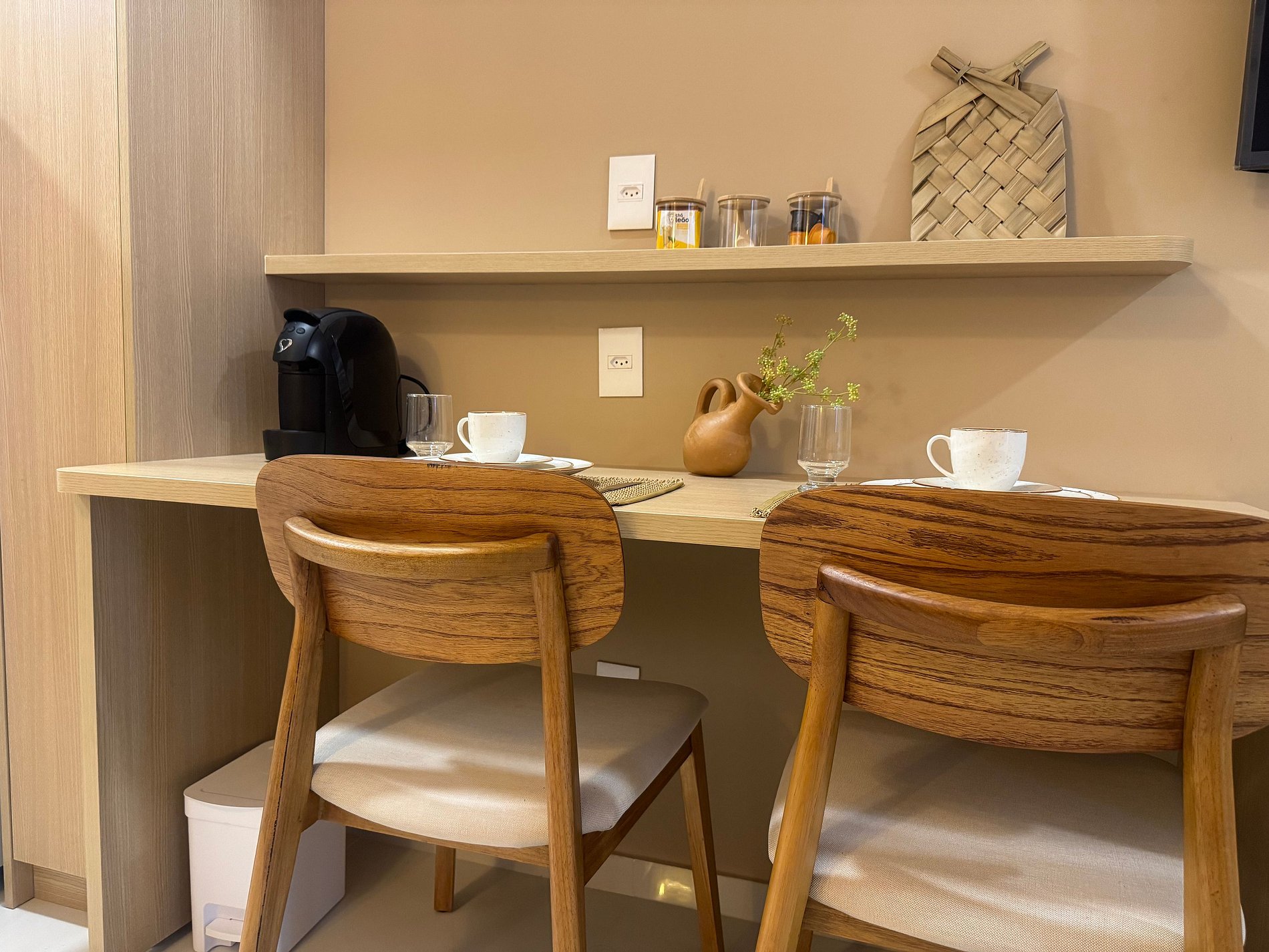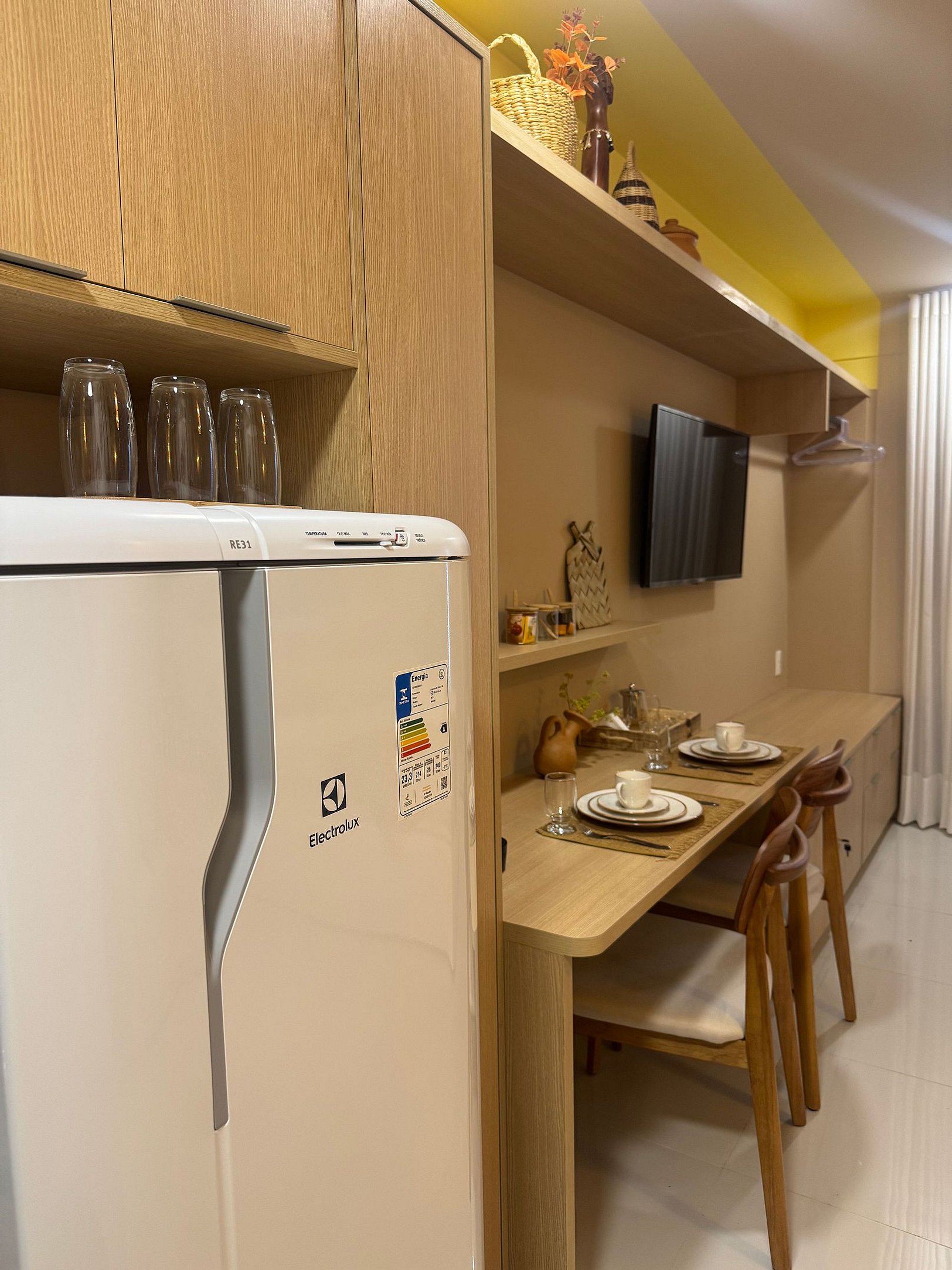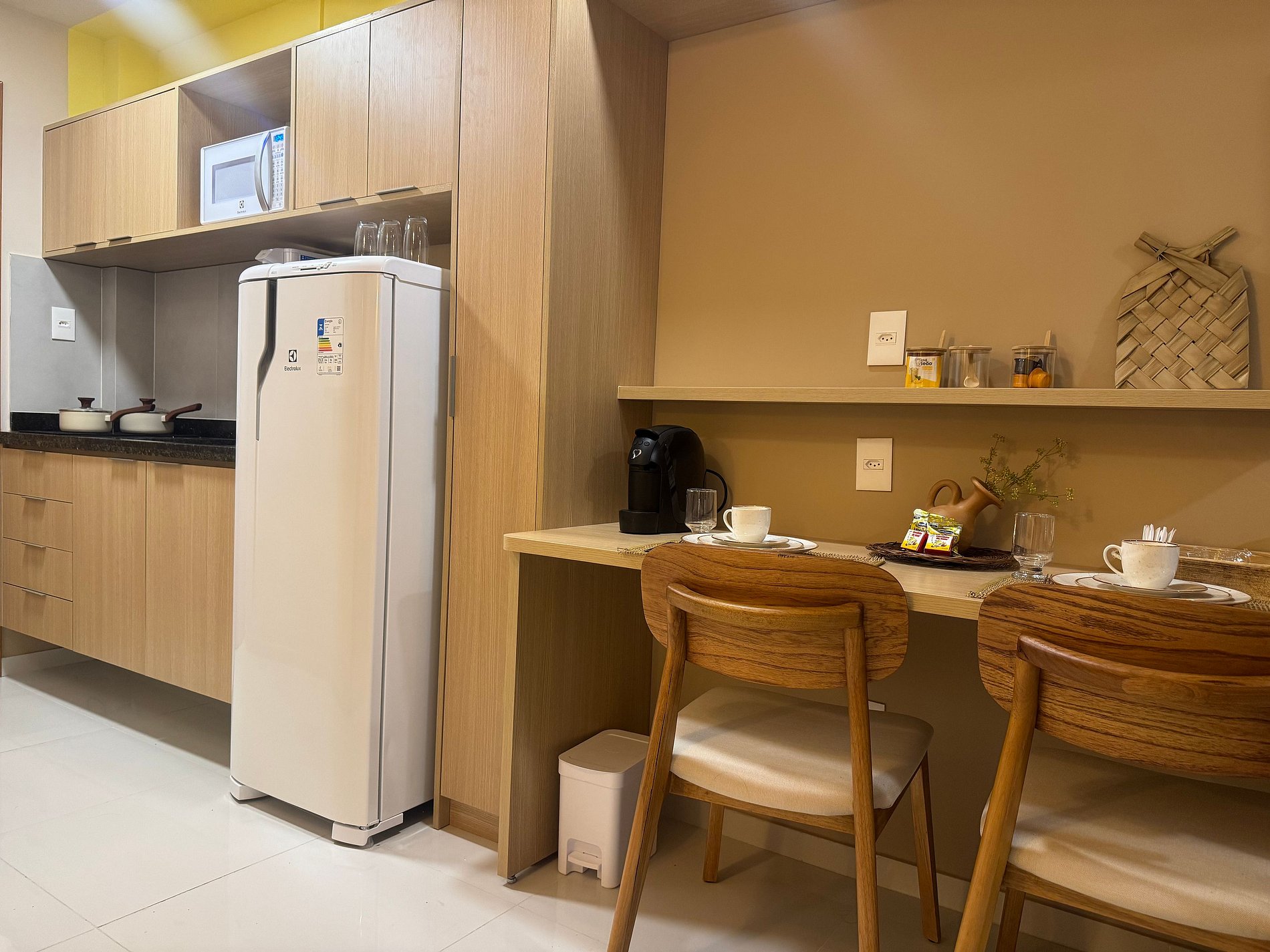 O apartamento é completo e funcional: cozinha equipada com geladeira, máquina de café, liquidificador, purificador de água, fogão de indução, micro-ondas e todos os utensílios necessários para preparar suas refeições com praticidade. Para seu conforto, oferecemos TV com 200 canais e Wi-Fi, ideal tanto para lazer quanto para trabalho.